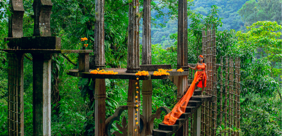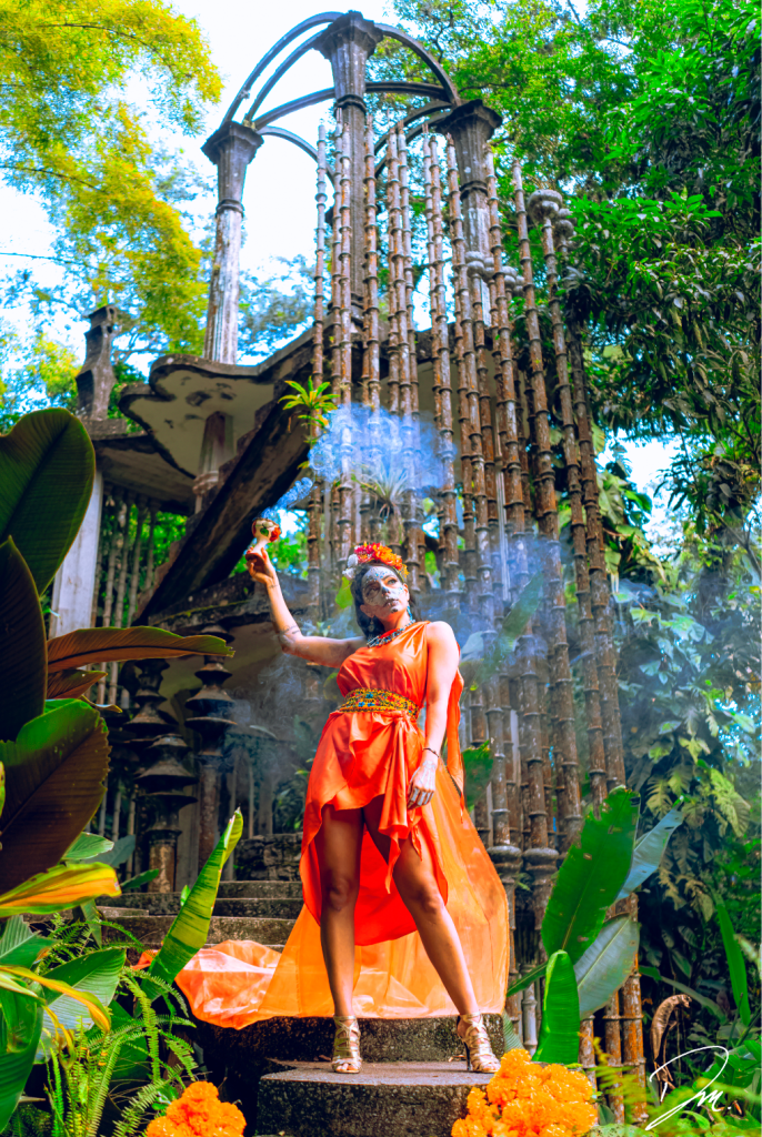 Las imágenes fueron tomadas en el Jardín Escultórico Edward James, Las Poza, ubicado en el pueblo mágico Xilitla. Su musa muestra las hermosas tradiciones de día de muertos al ser presentada como una catrina en un espacio surreal. Con ella también hace gala de otro orgullo del Estado, Jessica Parrilla es una joven atleta, modelo y actriz que demuestra el semillero talento que nace en San Luis Potosí.