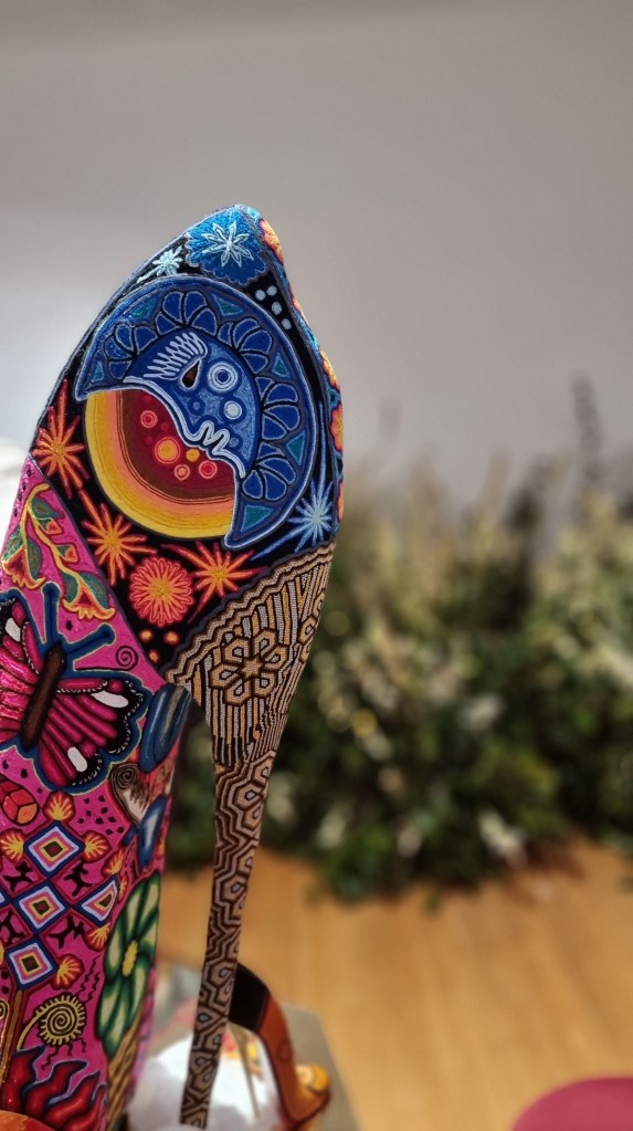 En la sala de arte huichol, tuve la fortuna de encontrarme con el maestro Hermenegildo Bautista con una réplica de la icónica botella del perfume Good Girl de Carolina Herrera cubierta por estambre y chaquira. Sin duda un deleite visual de la pieza y un aprendizaje de simbolismos asociados a las ceremonias y cosmogonía huichol, que explica el propio maestro.