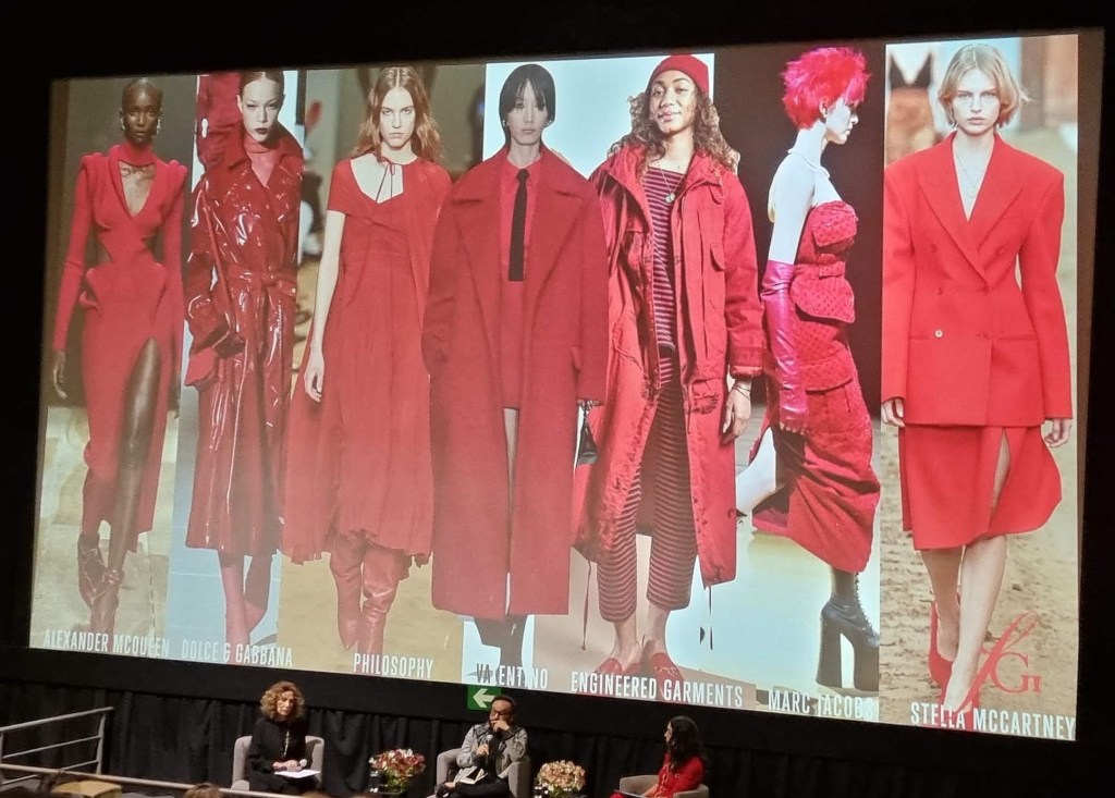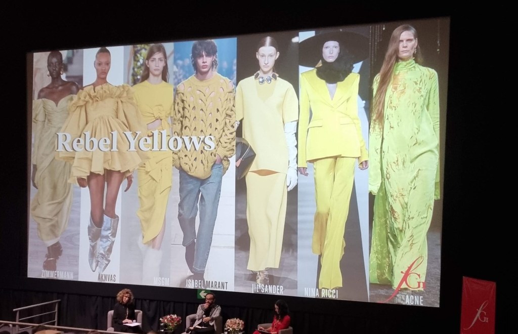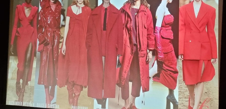 Se destacó la popularidad del rojo tanto en la indumentaria como en el maquillaje; el tono rosado, que para el caso de FW23 será hacia tonos más suaves (Petal Pink), los verdes, morados, grises (este último en una tendencia de trajes sartoriales), así como una paleta de colores más cálidos que nos llevarán a un sentimiento de sentirnos acogidos con los amarillos y el camel.
