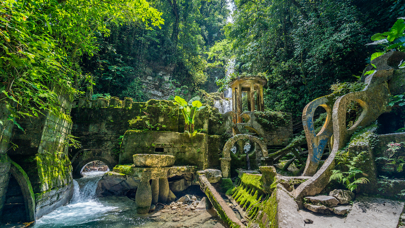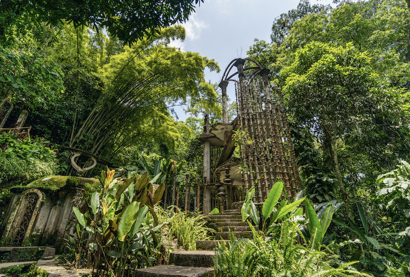 Las Pozas no es solo un jardín, sino un mundo fantástico compuesto por más de 25 estructuras surrealistas, que incluyen obras como el Palacio de Bambú y el Cinematógrafo los cuales simulan torres que parecen crecer entre los árboles, escaleras que no llevan a ningún lugar y puertas que se abren a paisajes de ensueño. El diseño del jardín se inspiró en la combinación de la naturaleza salvaje de la región, sus cascadas y la estética surrealista, creando un espacio donde la realidad y la fantasía se entrelazan.